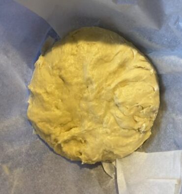 • Une fois la pâte bien pétrie, mettez la pâte dans un saladier tapissé de papier cuisson (ou a minima fariné).
