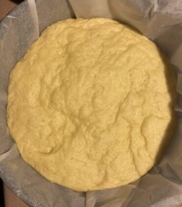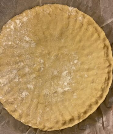 • Une fois que la pâte a levé, déposez-la avec le papier cuisson dans un grand plat à tarte (j’ai pris un plat de 30 cm de diamètre).