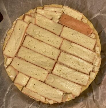 • Faites cuire 20 mn à 200°C puis 10 minutes de plus à 180°C. Si la tarte brunit trop, vous pouvez recouvrez d’une feuille de papier cuisson le temps de terminer la cuisson.