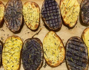 - Trim the potatoes with geometrical patterns of your choice, using the tip of a knife: strips, streaks, leaves, etc.